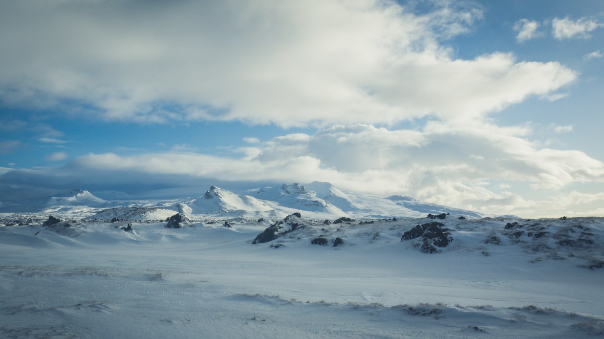 We checked and double-checked the weather forecast and road conditions before we set out that morning, a little nervous that we might have to change up our plans. The situation looked pretty good up until the town of Borgarnes, about halfway between Reykjavík and the Snæfellsnes, but some of the roads on the peninsula itself were still closed from a storm the previous night. After a little more debate, we decided to chance it, hoping that they would be cleared by the time we arrived a few hours later. It was still quite early when we headed out, the sun just beginning to rise from behind the thick layer of clouds stacked up high on the horizon. The weather was fairly unremarkable as we were making our way out of the city, not much different from a typical Toronto winter’s day, but nearly 30 minutes after we started, the situation changed drastically – white-out blizzard conditions swept across the barren hills in an instant, the terrible winds buffeting and rattling our lonely vehicle, welcoming us to the edge of the world.