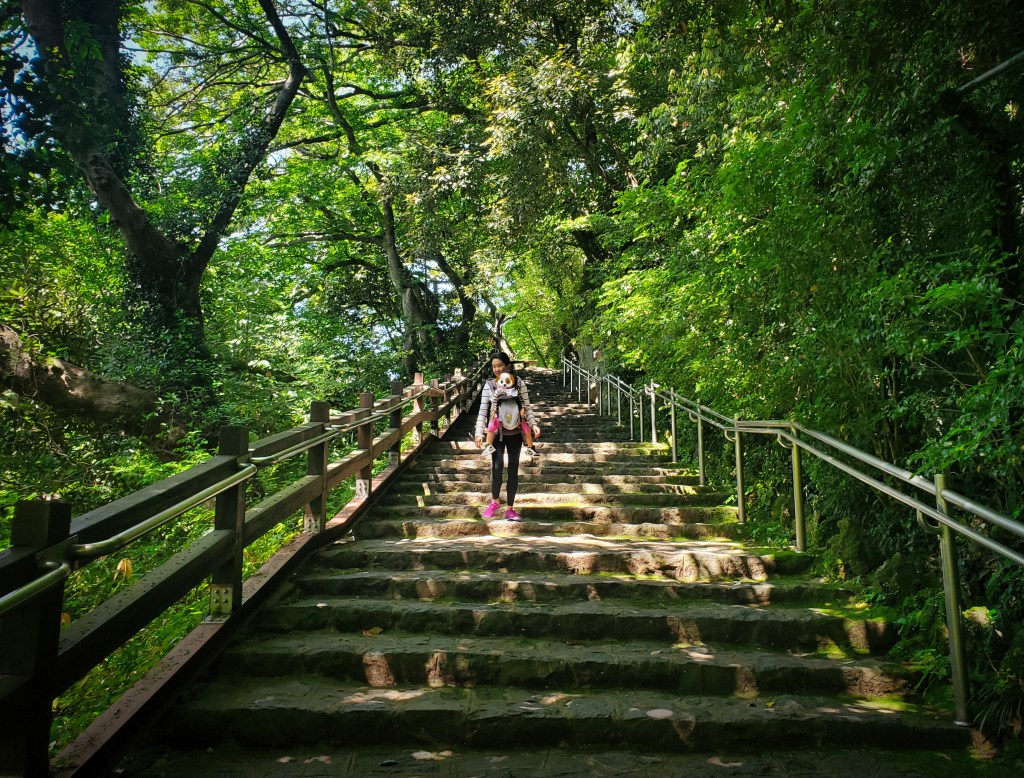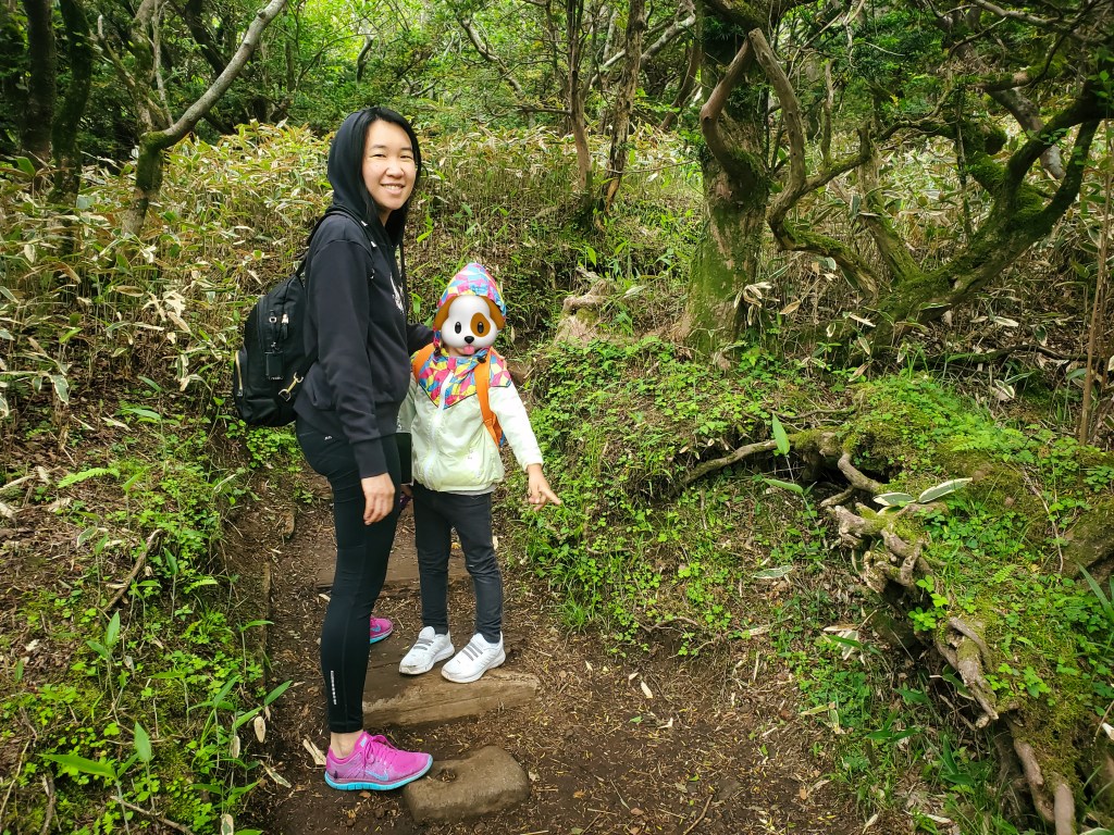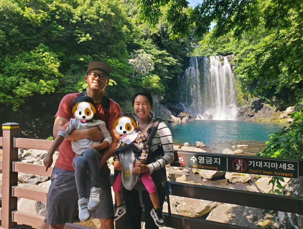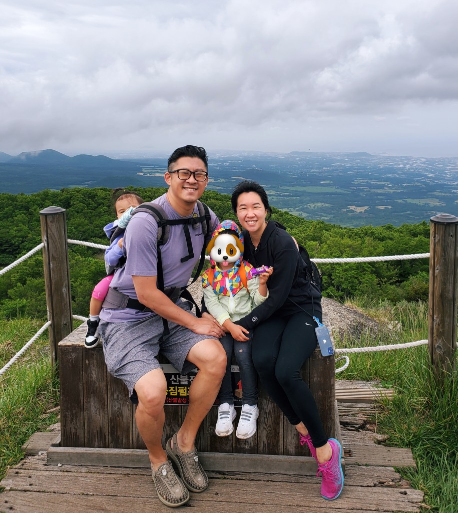 There was a light rain that morning, but after waiting it out for a bit we headed on up the trail with Olive strapped to my back and Miles happy to make his own way up the mountain path. He actually ended up hiking the entire way on his own, chattering about the rocks and trees as we climbed stair after stair after stair. After about 30 minutes of not-very-taxing exercise, we were rewarded at the top of the trails with some great views of Jeju’s lush landscape spread out before us. We took a few family photos and then headed back down to the car park.