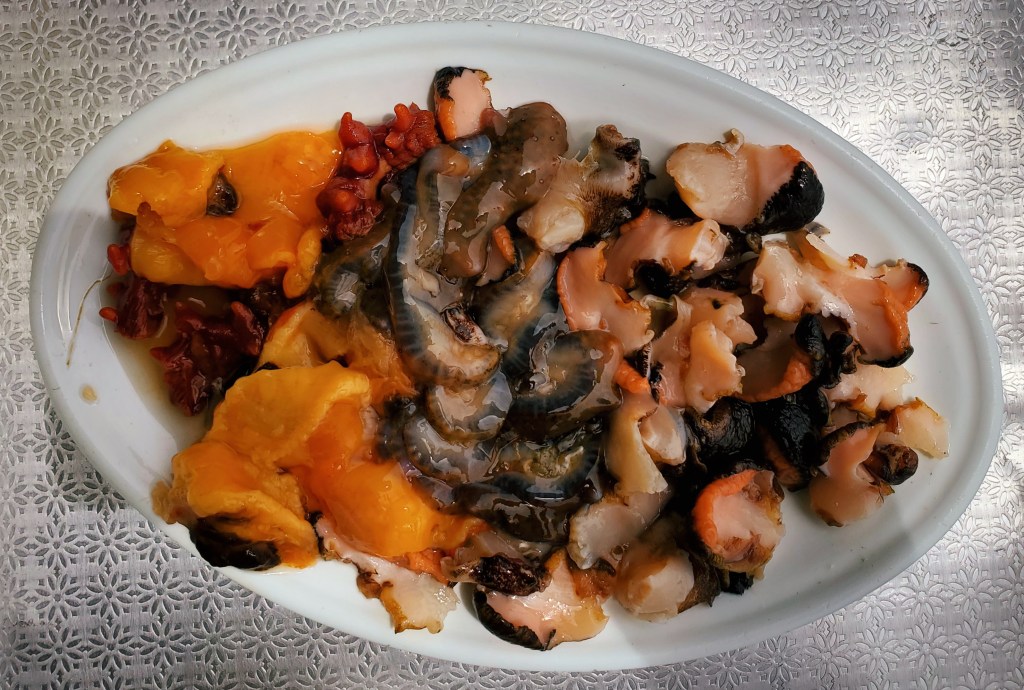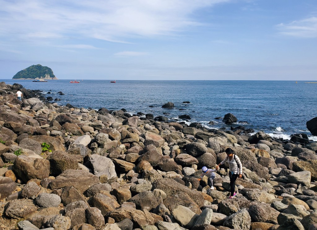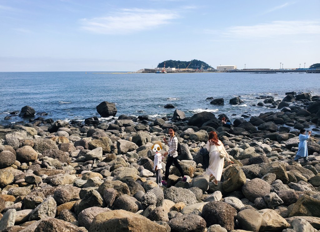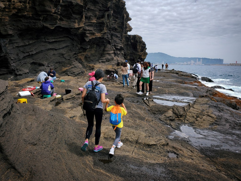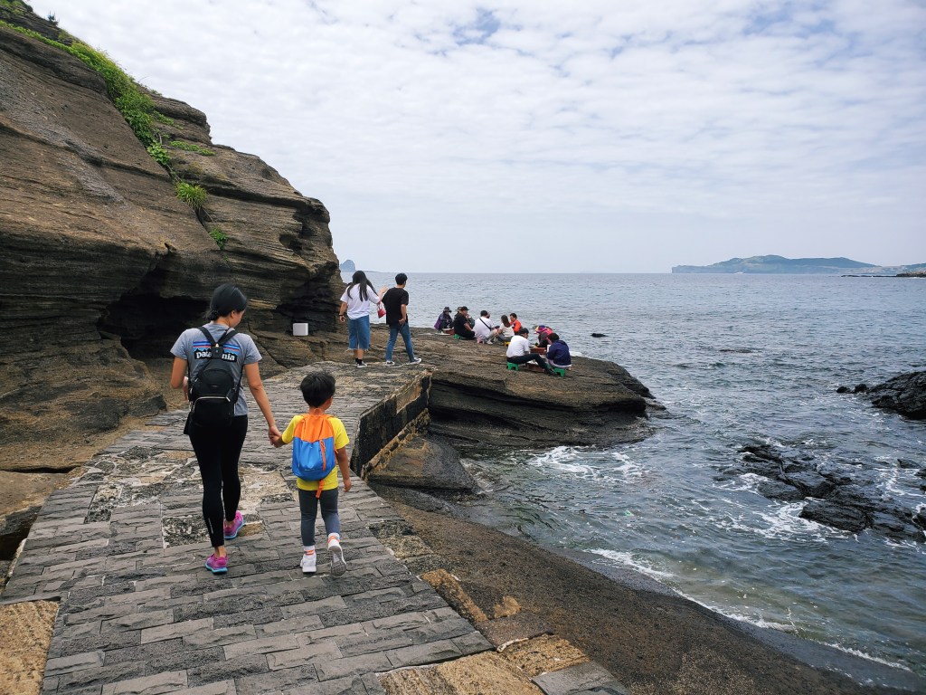 It took close to two hours to complete the full circuit, but that was us walking at a leisurely pace. We also stopped for a snack break with one of the groups of haenyeo, Jeju’s famous women sea divers, who regulatory set up shop along the seaside trail selling their freshly caught seafood. They sit on the side of the path with basins full of various shellfish and sea cucumbers, ready to start slicing and dicing up a plate of raw sea creatures should you pull up a seat at one of the small tables. The food was tasty, especially with the gochujang and vinegar sauce that comes with each order, but it also was a little more than I expected in terms of cost. Quite an interesting experience, though, to sit under dramatic oceanside cliffs, eating the bounty of the sea.