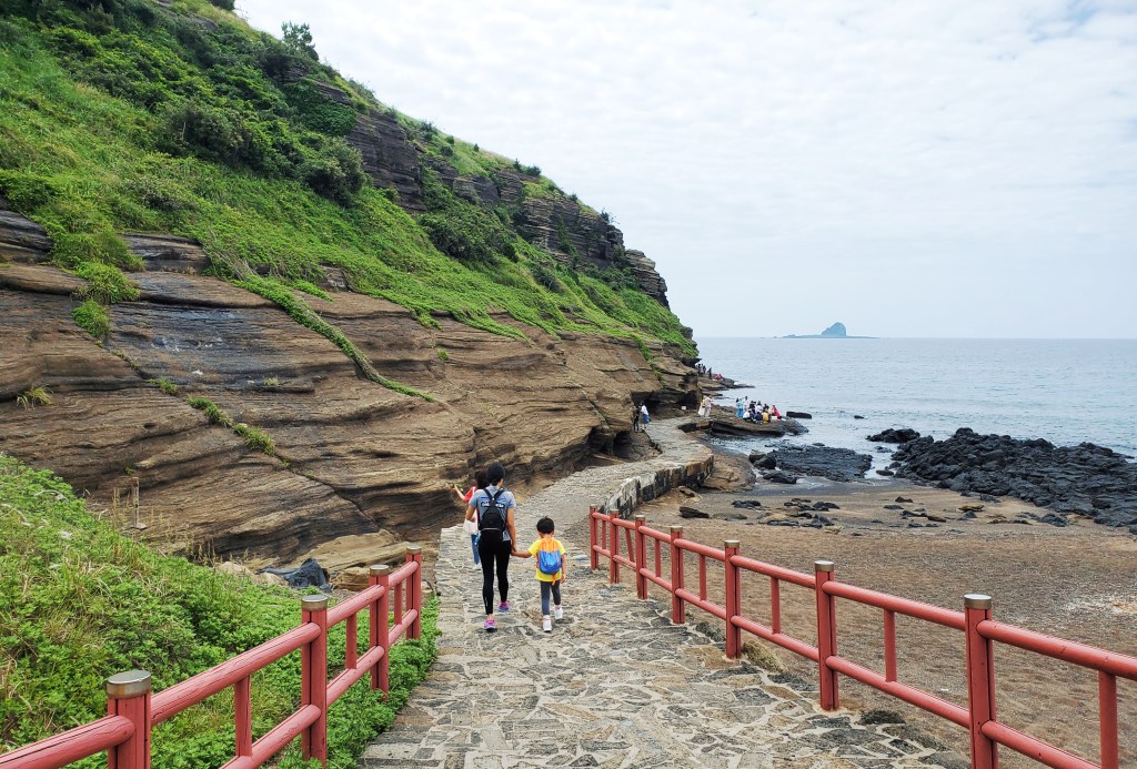 The Jeongbang Waterfall is a little bit further east along the south side, where it rushes off the coastal cliffs and plunges into the sea. The waters are imbued with the spirit of a resident dragon, said to have the power to cure diseases and end droughts. Access to the waterfall is via a long staircase, with the area around the waterfall made up of large stones that can be tricky to navigate for those with shorter legs.