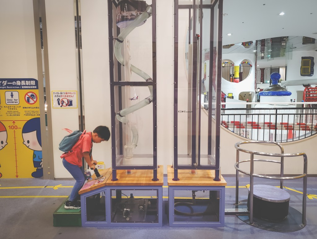 The Kids Plaza Osaka is multi-level activity centre located in the Kita ward, not far from our hotel. Admission for Miles was 800 yen (14o0 yen for adults), and to me it was well worth it. There are a ton of exhibits and sections dedicated to teaching kids about science, different cultures, disabilities, jobs and society, digital art, computers, etc., and there’s a massive jungle gym-type structure in the middle that spans all three floors of the plaza. All of the activities were well thought out and there were a ton of staff around to help out and give guidance. We went on a weekday afternoon so it didn’t feel very crowded at all, and Miles had plenty of space to run amuck for a couple of hours and do whatever his heart desired.