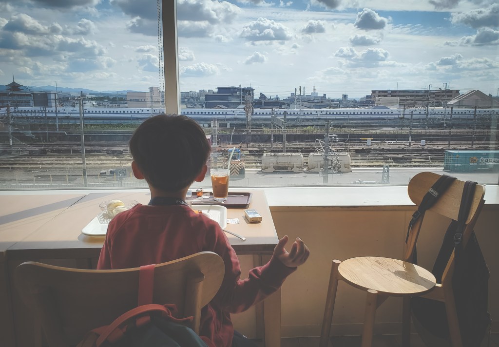 The Kyoto Railway Museum is a massive complex that houses both the former Umekoji Steam Locomotive Museum and exhibits from the now defunct Modern Transportation Museum in Osaka. Here you can wander through train yards full of decommissioned locomotives, drive toy trains through a giant diorama landscape, study public transport maps, operate a train crossing, learn how train engines work, and so much more. Miles went to the Denbus Train and Bus Museum in Kawasaki a year ago and loved it, but this museum is on another level completely. After a whole morning of running around from floor to floor we grabbed lunch in the museum cafe, and Miles said it had the best view of any restaurant. Our table was right up against the window overlooking a nearby set of tracks, and we kept tabs on each regular passenger train and sleek Shinkansen that passed us by.