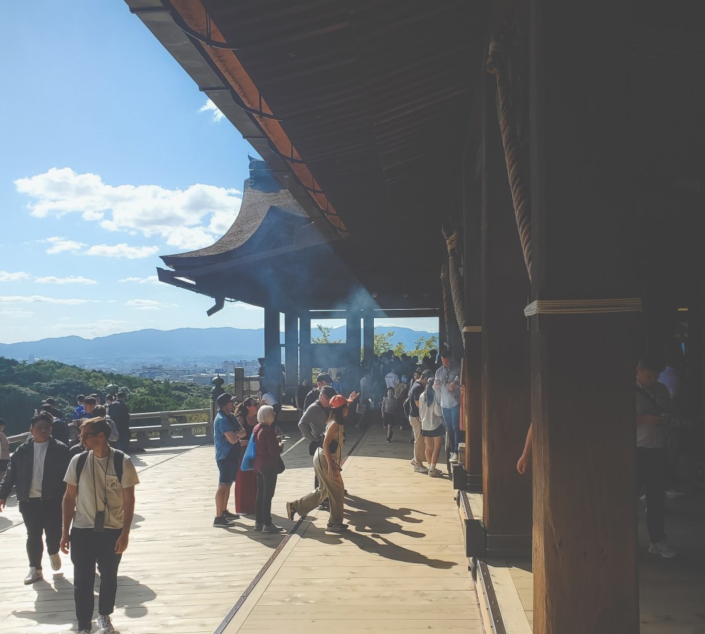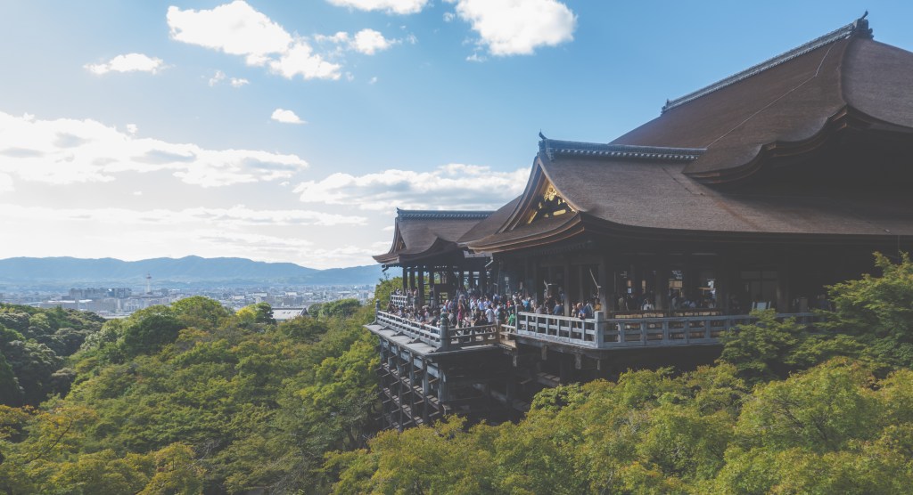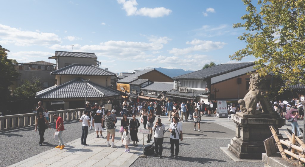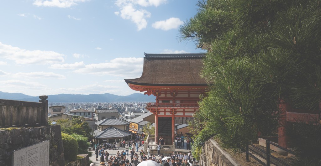 After lunch we took a car over to the Higashiyama part of town, nestled up against the mountains that form the eastern edge of Kyoto. This is where a lot of the historic districts of the city are to be found, including the narrow laneways that lead to Kiyomizudera. The 8th Century Buddhist complex and its large veranda overlooking the forested hillsides and the city below should be recognisable to anybody who grew up consuming Japanese pop culture (me), and it remains a popular mainstay of the Kyoto tourist circuit – the dense crowds surrounding us as we made our way up the hill was testament to that. Miles and I retraced the steps that Ashley and I took eight years ago, taking in the views from the veranda in front of the main Hondo Hall, and the views of the veranda from the nearby Okuno-in Hall, which I do prefer. From there we walked back out to the Sai-mon, or West Gate, and looked out over Kyoto until it disappeared into the Arashiyama hills on the other side of the city.