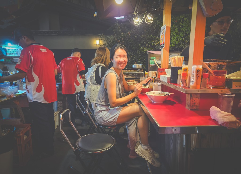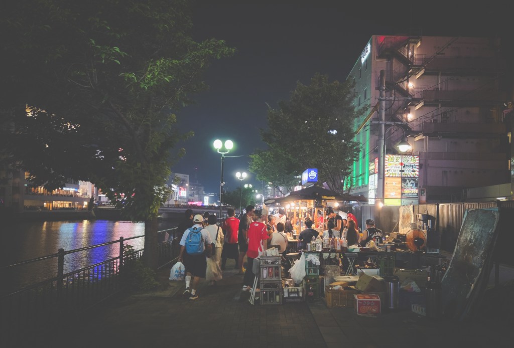 One big perk of traveling and staying together with family is the opportunity leave the kids at home with the grandparents at night to go out on our own, something we had not done since 2017, the last time we went to Japan before starting our family. Even when we went to Tokyo with Ashley’s side of the family last December, we had all stayed in separate rooms at different hotels. As such, I had been looking forward to doing one thing at night in Fukuoka with Ashley for months – go and eat something at the city’s famous yatai stalls.