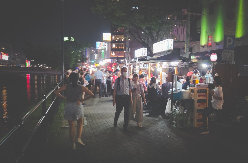 There’s a bunch of places where such open-air food stalls can be found, and we went to the ones congregated along the southern tip of Nakasu Island. My sister and brother-in-law had passed by a few nights before and reported back that it was absolutely packed, but I figured even if it was too crowded to get a seat I still wanted to see it with my own eyes. Happily for us, the crowds were very manageable, even on a Friday evening. There was enough to give the place a good buzz, but not to the extent that we felt intimidated and discouraged from even trying to squeeze in for a meal. We ended up choosing a stall that sold Fukuoka’s classic Hakata-style ramen, which we greatly enjoyed despite the summer heat. All in all, food and vibes were worth it.